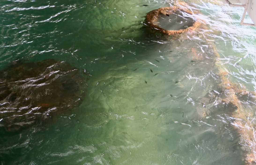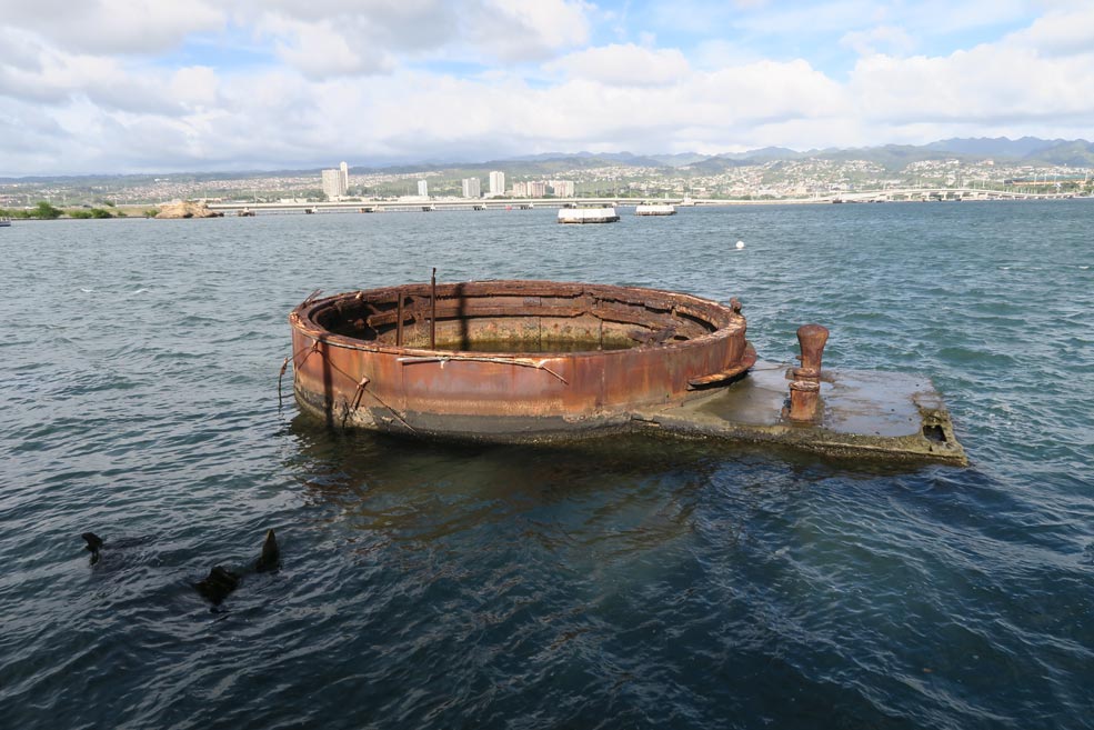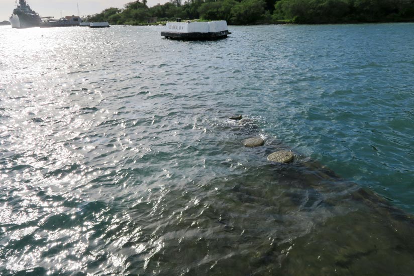 When you walk onto the memorial, you have the ship on either side of you in the water. There are also areas inside where you can look down and see the ship below you. Depending on the day and where you look, you may be able to catch a glimpse of oil still coming up from the ship – hard to believe that can still happen 79 years after the attack.